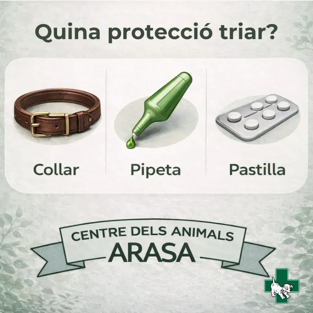 - Consideracions: Són l’opció més forta contra puces i paparres, però no fan res contra el mosquit. Existeixen pastilles que actuen alhora contra paràsits externs i interns, però no les aconsellem perquè no n’hi ha cap que realment els elimini tots.